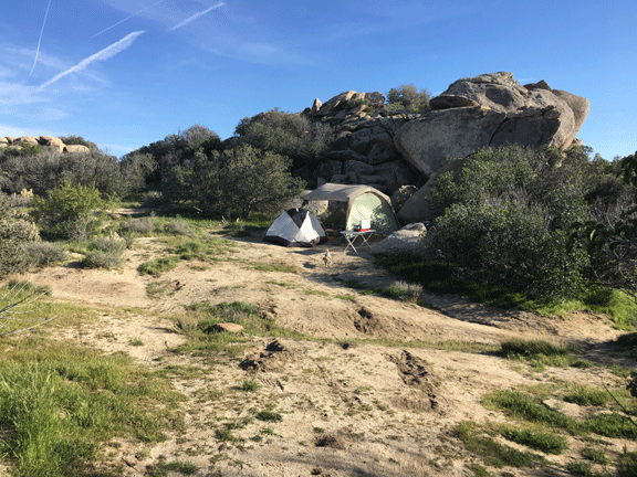 The next day we moved to Culp Canyon Primitive Campground. This was a sweet spot—and free! I set up right next to some giant rocks that provided shade throughout the day, and privacy too. There were plenty of other folks camping there, but it never felt crowded. At night it was quite a bit colder than at Borrego, being about 3000ft higher in elevation. But Mugsy and I snuggled up in our blankets, and stayed warm and cozy.