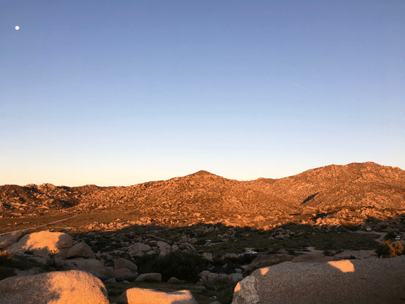 The social media frenzy surrounding this rare bloom brought throngs of people to the park. The one developed campground, Borrego Palm Canyon, was completely booked except for a couple group sites. So what did we do? Mugsy and I camped in a 25-person site, just the two of us, and it was gorgeous! After a little exploring, we were back at camp for the stunning pink sunset, complemented by my pink pom margarita. And we were entertained by five bighorn sheep romping on the hillside! The air stayed warm all night, and I lay under the stars for hours taking in the immensity of it all.