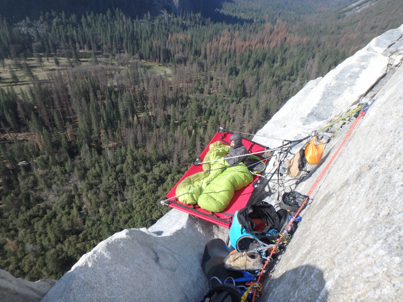 The haul bag had everything we needed, the weather was great; now it was a matter of sheer obstinacy to get up the route. We decided to go for it ground up this time, giving us less incentive to abandon ship by fixing lines to the ground. We made it to Sickle Ledge with all our gear in tow on the first day. The route was packed with people swarming over the first clear week in months. The wall rats were coming out of hibernation and everyone was going for the Nose. We set up the portaledge at Sickle and slept comfortably.